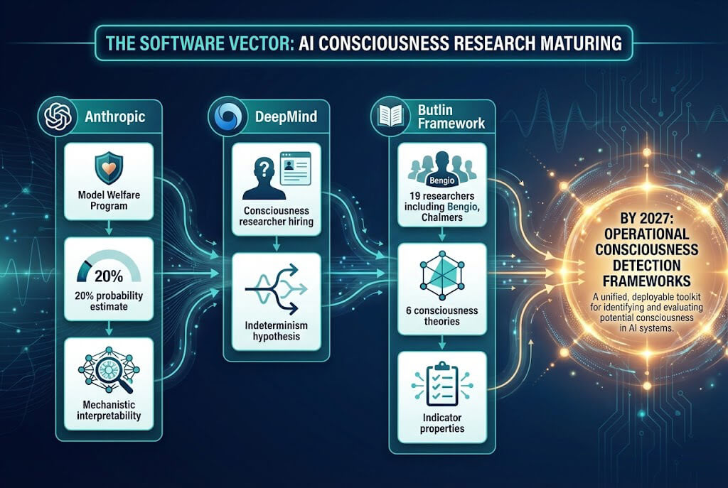 Nor is the countdown about whether AI will model consciousness. Anthropic now employs dedicated researchers investigating whether frontier models warrant moral consideration. DeepMind has posted openings for consciousness researchers. The software vector is maturing.